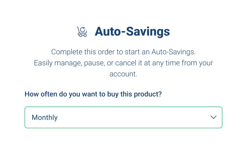 Finish placing your first order and that’s it, your Auto-Savings plan has now started! So, if you selected monthly purchases and today’s May 1, your next automatic purchases will happen on June 1, July 1, August 1, etc.