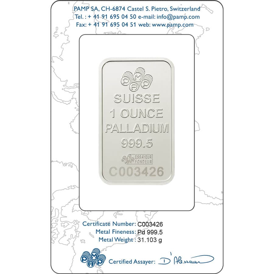 This palladium ingot weighs 1 ounce (oz), or 31.10 grams (g). It is produced by PAMP Suisse and is beautifully decorated with the famous Roman goddess Fortuna, the daughter of Jupiter.