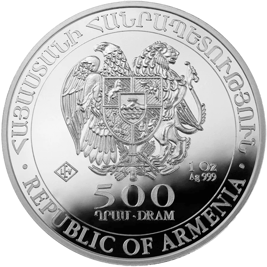 The obverse of the coin features the Armenian Coat of Arms, face value in Armenian Dram, as well as the purity, the weight, and the year of issue of the coin. The lettering “Republic of Armenia” in Armenian and English languages surrounds the ensemble.
