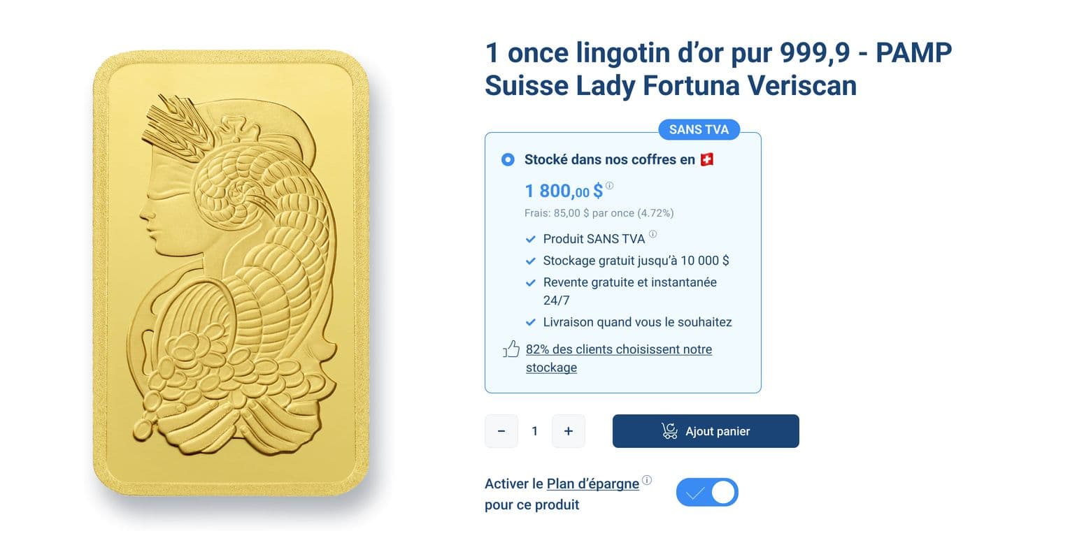 Les produits achetés dans un Plan d'épargne sont uniquement destinés au stockage et ne peuvent pas être livrés au moment de leur achat. Ils seront stockés et assurés en toute sécurité dans nos coffres-forts en Suisse. Nous offrons un stockage gratuit jusqu'à 10 000 CHF/EUR de valeur stockée, et seulement 8 CHF/EUR par mois si vous stockez entre 10 000 CHF/EUR et 100 000 CHF/EUR dans nos coffres. Pour en savoir plus sur notre solution de stockage, cliquez ici.
