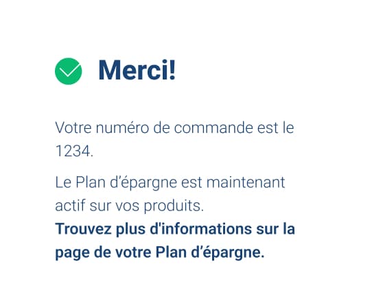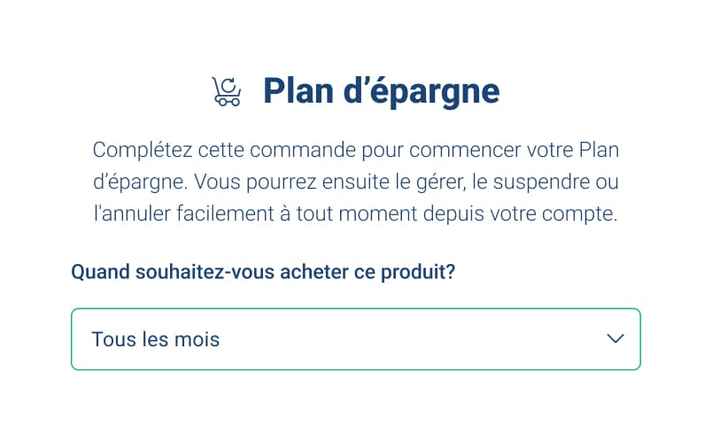 Terminez votre première commande et voilà, votre Plan d'épargne a commencé! Ainsi, si vous avez choisi des achats mensuels et que nous sommes le 1er mai, vos prochains achats automatiques auront lieu le 1er juin, le 1er juillet, le 1er août, etc.