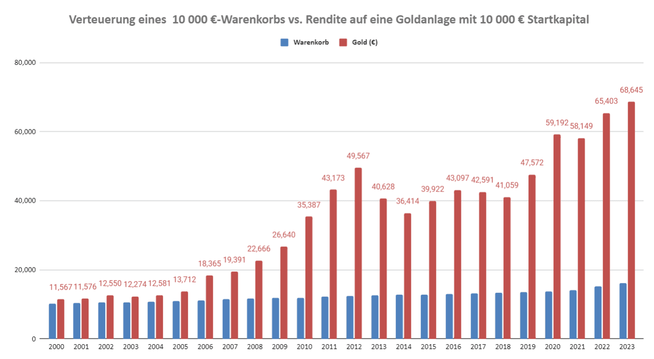 Ende 2023 war die Spareinlage schließlich 13 019 € wert, der Warenkorb hatte sich jedoch von 10 000 € auf 16 200 € verteuert.