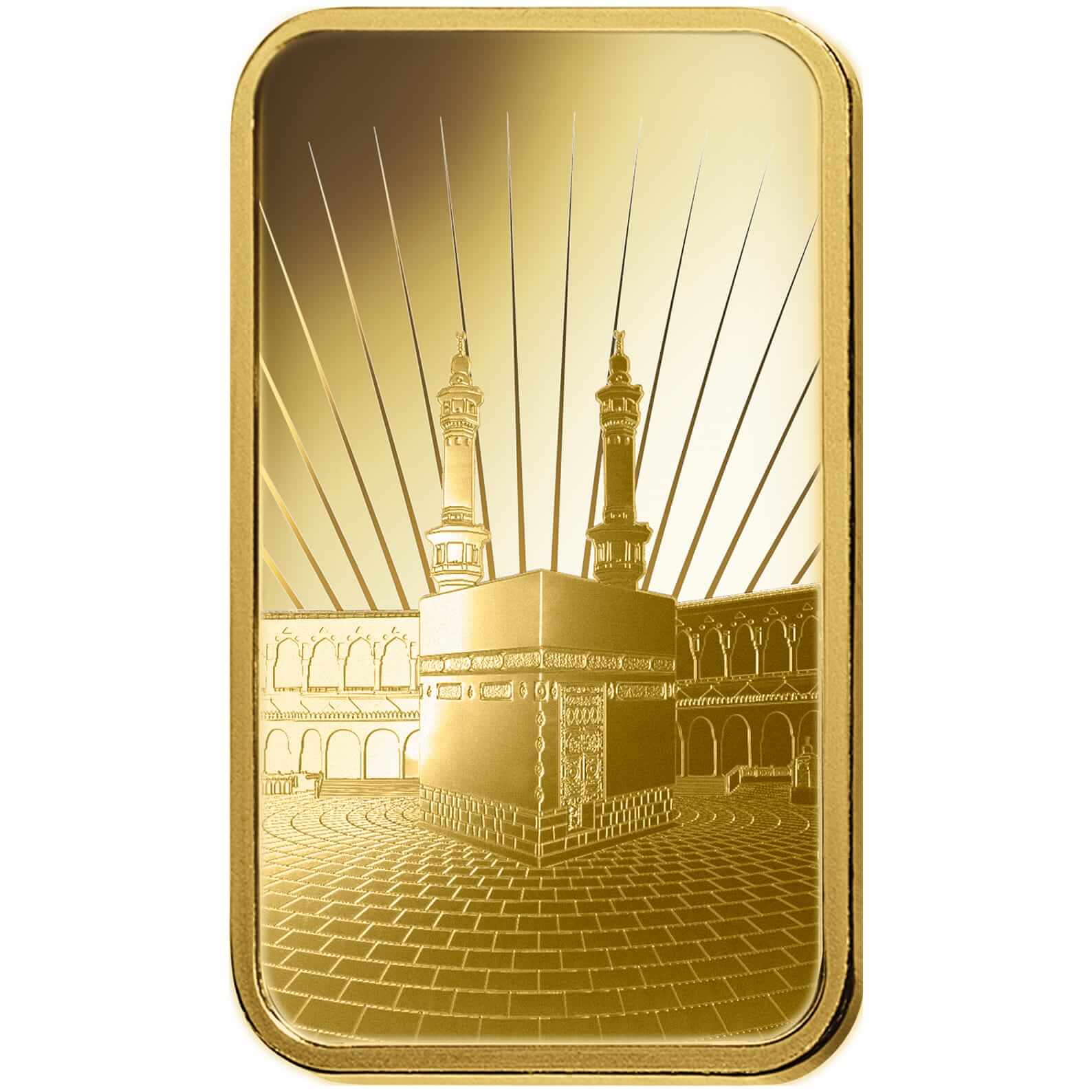 Der wunderschöne religiöse Barren aus Gold steht für Ka'Bah Mecca. Die Rückseite ist mit Gewicht, Reinheit und einer eindeutigen Seriennummer versehen.