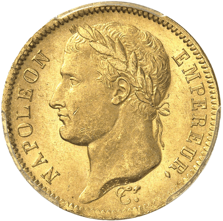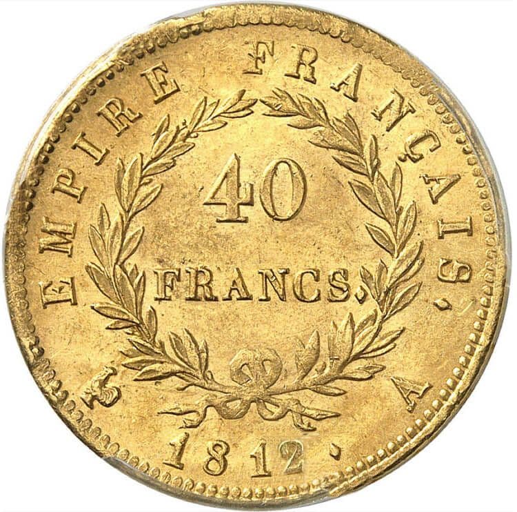 On the obverse is represented the laureate head (tête laurée) of Napoleon looking to the left and the name of the engraver, Jean-Pierre Droz. On the reverse, the value of the coin is 40 Francs in a crown formed by two olive branches tied at their base. The date 1812 is framed by the workshop letter A (Paris) and the symbol of the General Engraver.