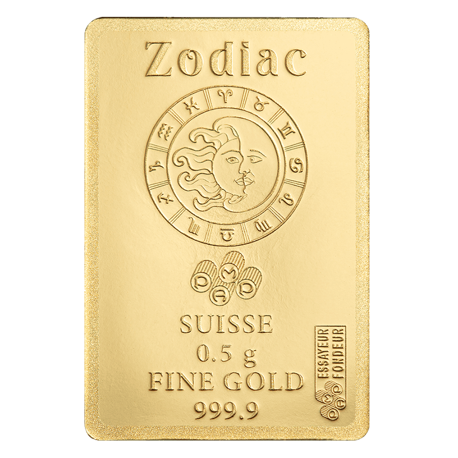 - Rückseite: Trägt die Inschriften „Zodiac“, „0,5 g“, „Fine Gold“ und „999,9“ sowie das offizielle PAMP-Prüfzeichen zur Bestätigung von Gewicht und Reinheit.