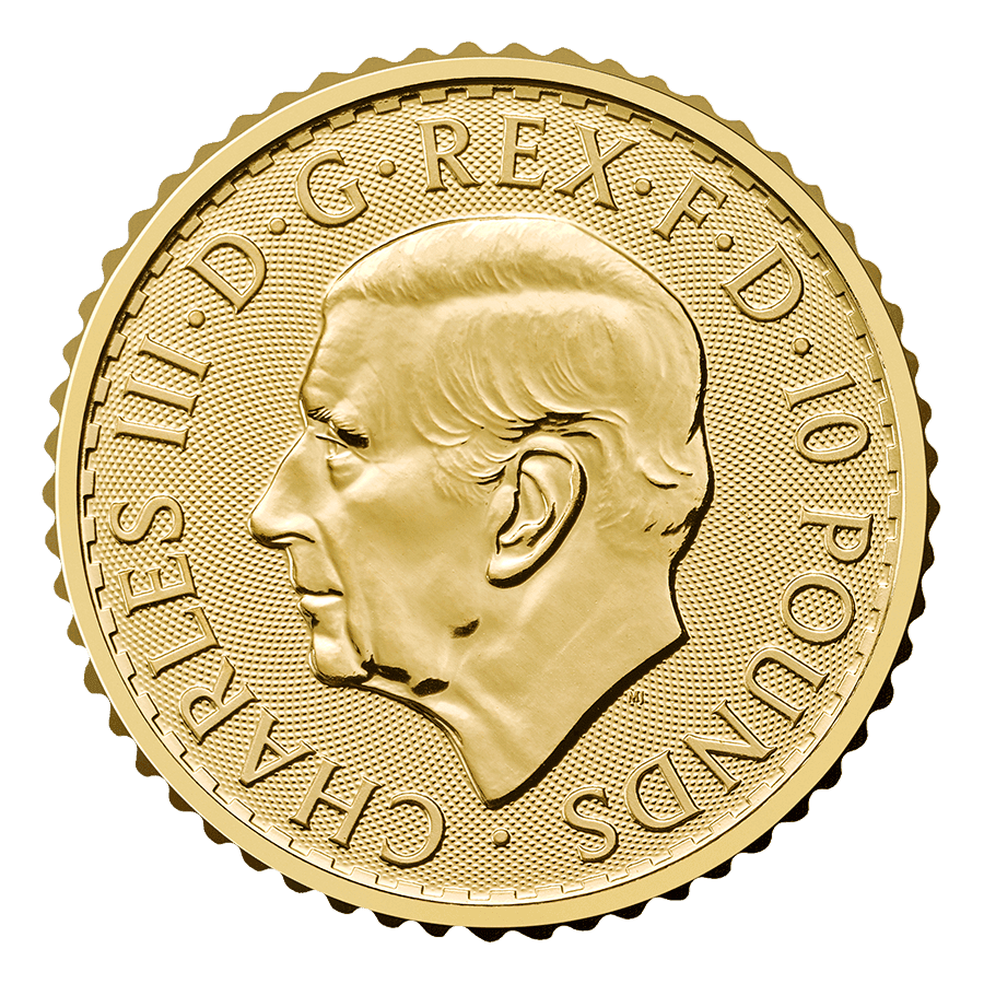 - Rückseite: Britannia in ikonischer Haltung mit Schild und Dreizack, umgeben von Sicherheitsmerkmalen wie Mikroschrift, latenter Gravur und lichtreaktiven Details. Die Umschrift lautet: „BRITANNIA • 1/10 oz • 999.9 FINE GOLD.“