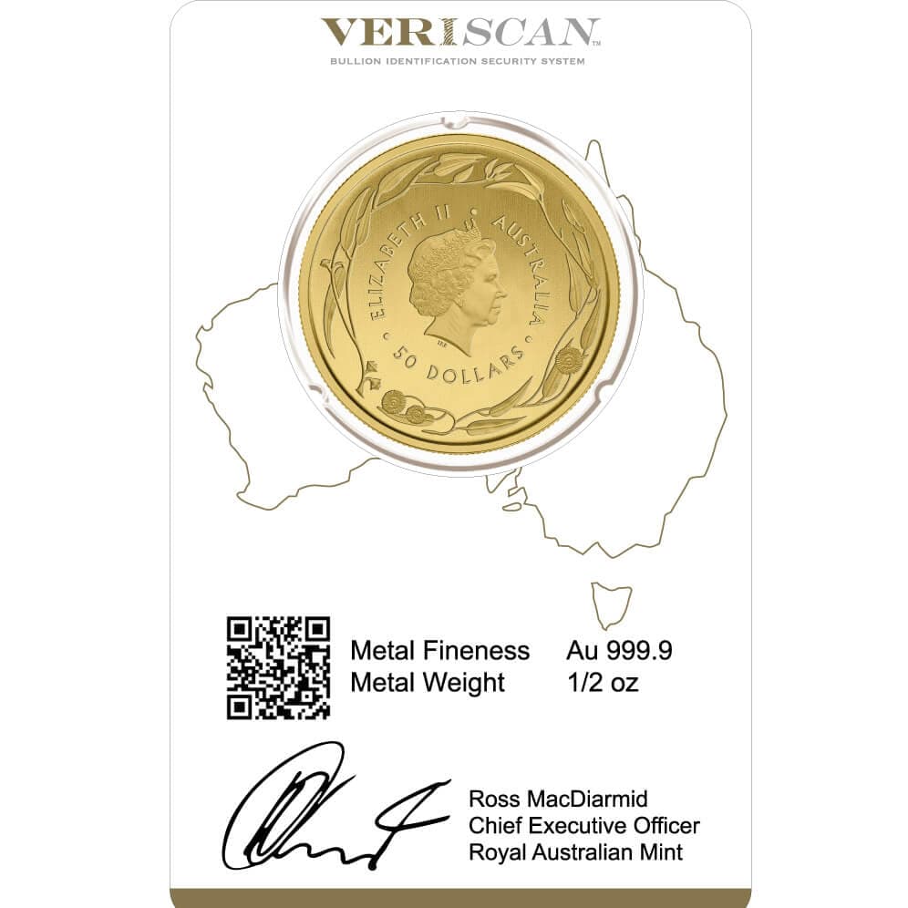 Auf der Vorderseite sehen wir das Seitenprofil von Königin Elizabeth II. sowie ihren Namen, den Herstellungsort, das Herstellungsjahr, und den Nennwert. Auf der Rückseite der Münze sehen wir ein klassisches rotes Känguru mit dem Commonwealth-Stern. Über dem Design ist "Australia" eingraviert und am unteren Rand ist das Gewicht und die Reinheit des Goldes zu sehen. Außerdem enthält jede Seite der Münze zur Verzierung die Blätter des blauen Eukalyptus.