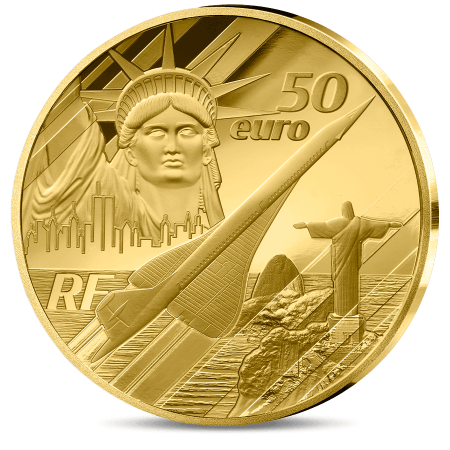 - Vorderseite: Entworfen von der Monnaie de Paris und illustriert von Romain Hugault zeigt diese Seite eine Ansicht der Concorde von oben, wobei der Eiffelturm nahtlos einen ihrer Flügel bildet. Vertikale Linien betonen die Geschwindigkeit des Flugzeugs. Ergänzt wird das Motiv durch das Zitat „50 ans de la mise en service du Concorde“ sowie das Jahr der Ausgabe.