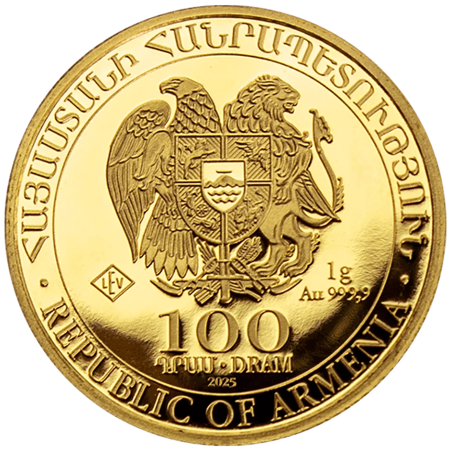- Vorderseite: Das Wappen der Republik Armenien, das einen Adler und einen Löwen zeigt, die ein Schild mit einer Darstellung der Arche Noah in der Mitte halten. Die Aufschriften umfassen „100 Dram“, das Gewicht „1 Gramm“, die Reinheit „Au 999,9“ und das Jahr „2025“.
