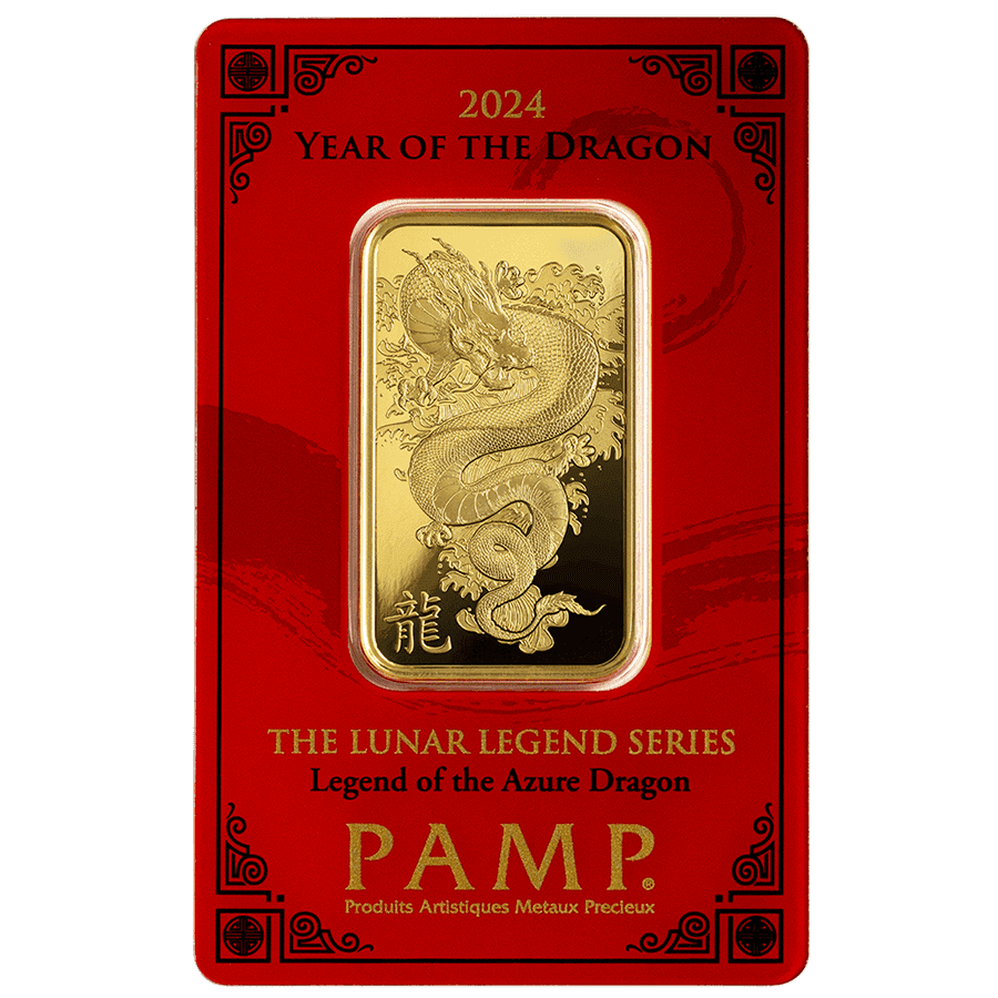Dieser Monddrache-Goldbarren misst 24 mm in der Länge und 41 mm in der Höhe. Und wie unsere anderen 1 oz. Goldbarren ist auch dieser Monddrache-Barren aus hochwertigem Gold mit einem Feingehalt von 999,9 ‰ gefertigt. Passend zum Thema des Mondneujahrs ist dieser Monddrache-Goldbarren in einer roten CertiPAMP-Verpackung mit goldfarbenem Schriftzug versiegelt (bitte beachten Sie, dass dieser Barren ohne Umschlag geliefert wird).