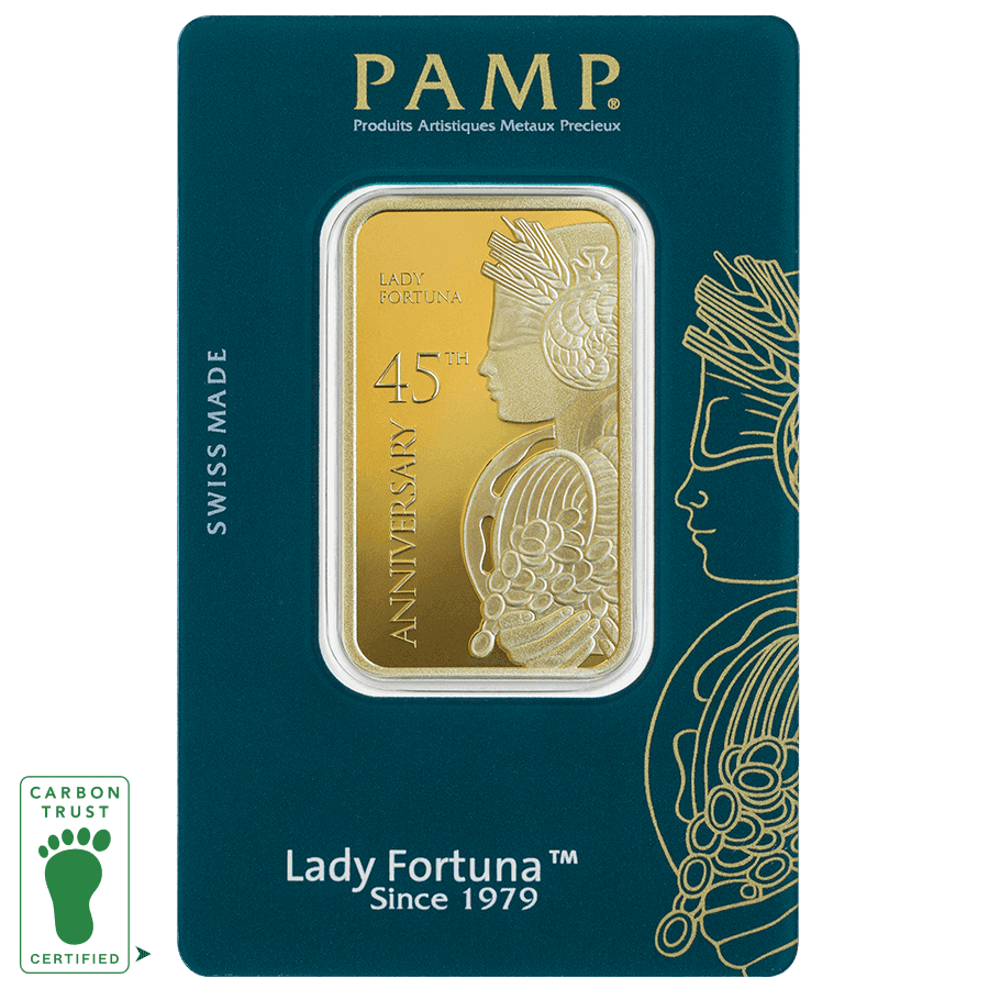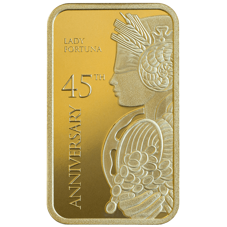 Neben dem Design der Lady Fortuna sind die Inschriften „Lady Fortuna" und „45th anniversary" zu sehen, die sie von anderen üblichen Lady Fortuna-Goldbarren abheben.