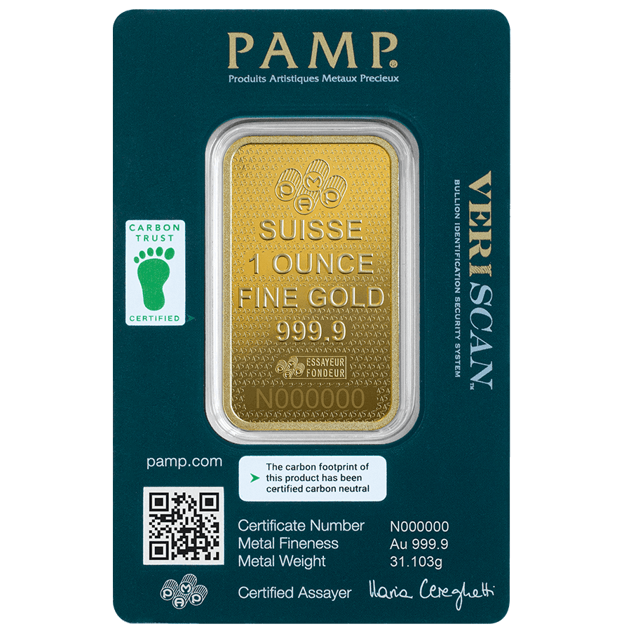 Der Goldbarren ist aus 999,9 % reinem Gold gefertigt, wiegt 1 Unze (31,10 g) und hat eine Breite von 24 mm und eine Länge von 41 mm. Und wie jeder andere PAMP-Goldbarren, ist jeder Barren mit einer CertiPAMP™-Prüfkarte ausgestattet, die seine Echtheit garantiert.