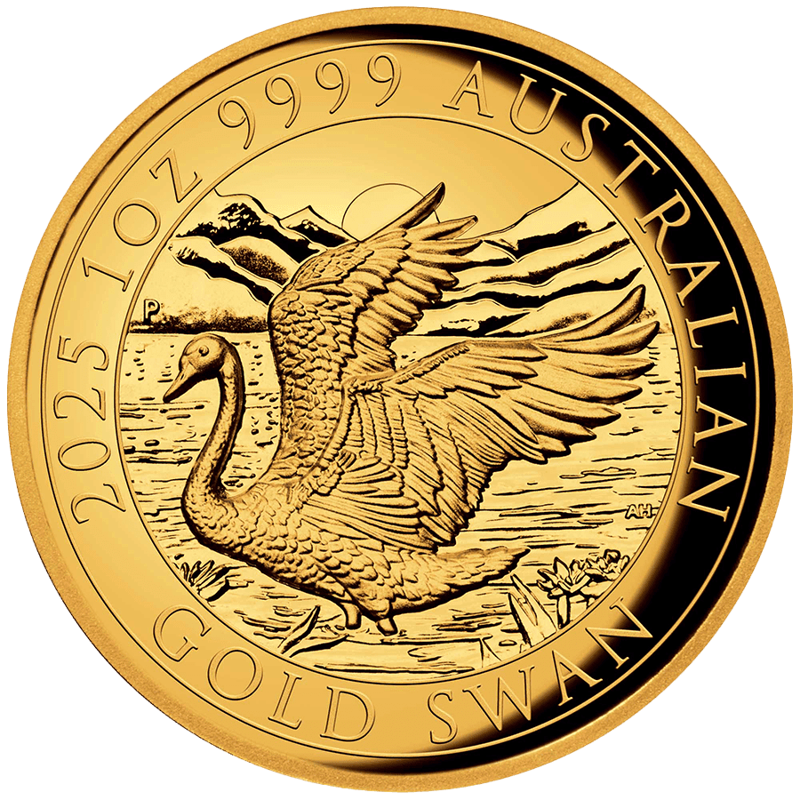 - Rückseite: Zeigt einen stolzen Schwan mit ausgebreiteten Flügeln im seichten Wasser vor einem dramatischen Sonnenaufgang über den Berggipfeln. Das Motiv ist in besonders plastischem Hochrelief ausgeführt und trägt die Inschriften „The 1 oz .9999 Australian Gold Swan“, die Jahreszahl „2025“ sowie das charakteristische „P“-Prägezeichen der Perth Mint.