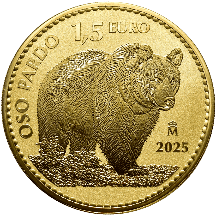 - Rückseite: Zeigt den Iberischen Braunbären („Oso Pardo“) mit fein ausgearbeitetem Fell. Die Inschrift „OSO PARDO“ verläuft am linken Rand, ergänzt durch den Nennwert „1,5 EURO“, das Münzzeichen „M“ und die Jahreszahl „2025“.