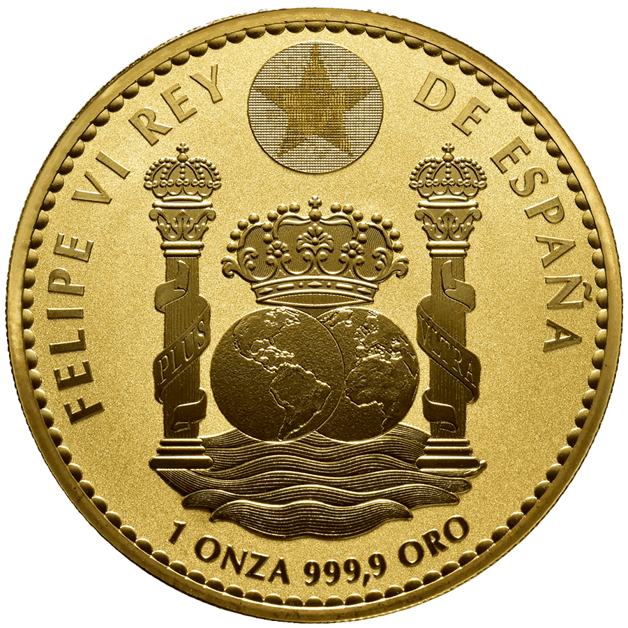 - Vorderseite: Zeigt die gekrönten Säulen des Herkules mit dem lateinischen Motto „PLUS ULTRA“ auf einem Banner, dahinter zwei Halbkugeln als Symbol für die Alte und die Neue Welt. Die Inschrift „FELIPE VI REY DE ESPAÑA“ sowie das Gewicht und die Reinheit „1 ONZA 999,9 ORO“ umrahmen das Motiv.