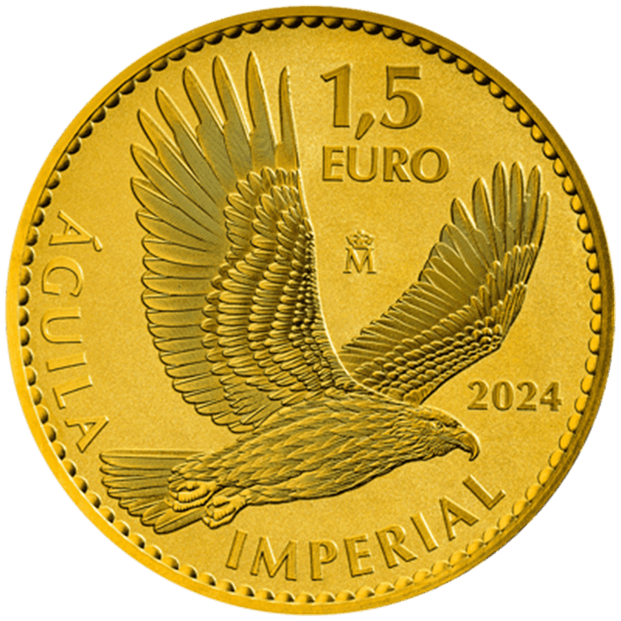 - Rückseite: Zeigt einen fliegenden Kaiseradler mit scharfen Details sowie die Inschriften „ÁGUILA IMPERIAL“, „1,5 EURO“ und „2024“.