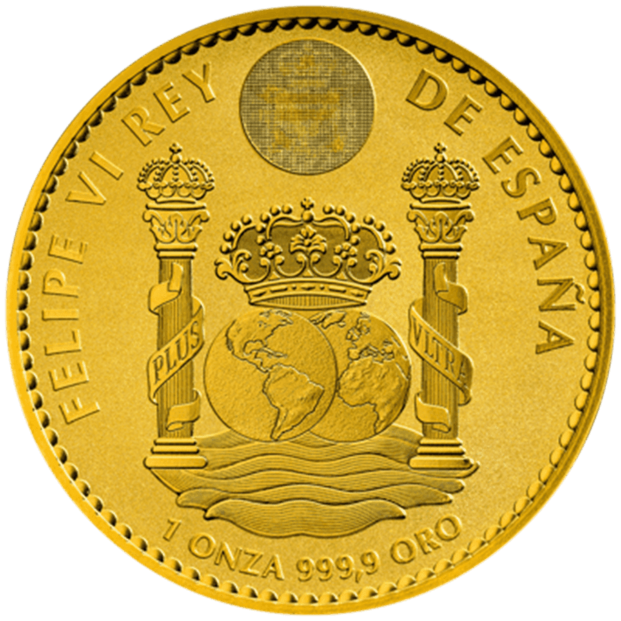 - Vorderseite: Zeigt zwei gekrönte Weltkugeln zwischen den Säulen des Herkules – ein Symbol für die Alte und Neue Welt – umgeben von der Inschrift „FELIPE VI REY DE ESPAÑA“ sowie einem Sicherheitsmerkmal mit Latentbild.