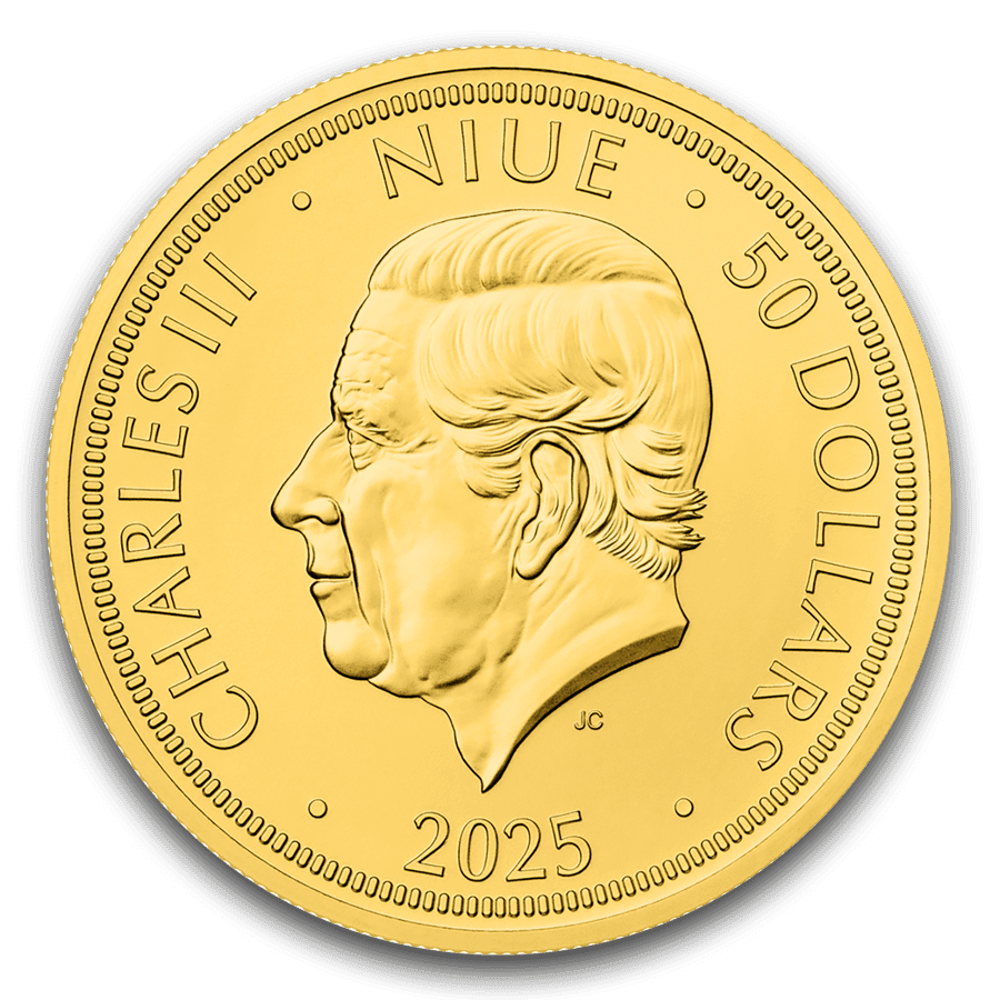 - Vorderseite: Zeigt das Porträt von König Charles III. zusammen mit den Inschriften „NIUE · 50 DOLLARS · 2025“, die den Status als offizielles Zahlungsmittel bestätigen.