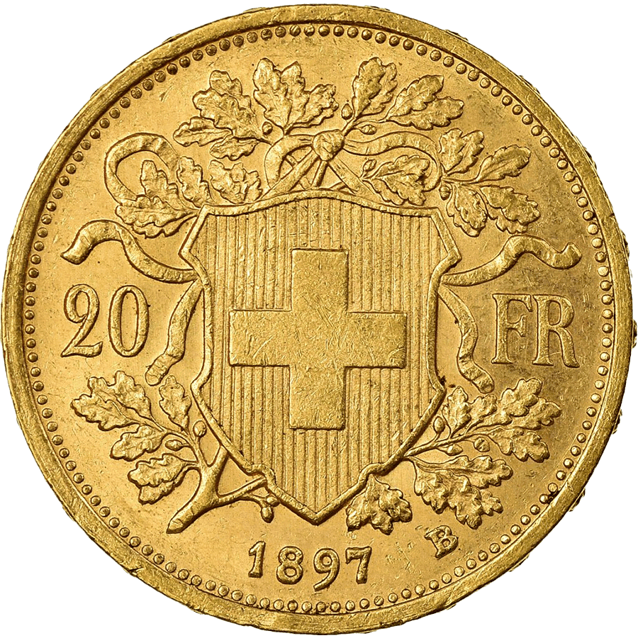 - Rückseite: Schweizer Wappen mit Kreuz vor einem Eichenzweig, umgeben von der Wertangabe „20 FR“ und dem Prägejahr „1897“.