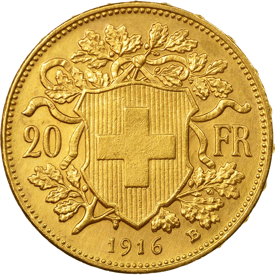 - Rückseite: Schweizer Wappen mit Kreuz vor einem Eichenzweig, umgeben von der Wertangabe „20 FR“ und dem Prägejahr „1916“.