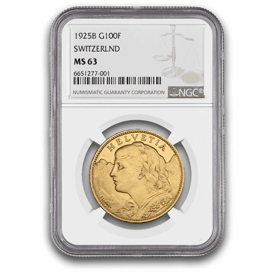 1925 Helvetia Vreneli Goldmünze - MS-63 NGC - 100 Franken