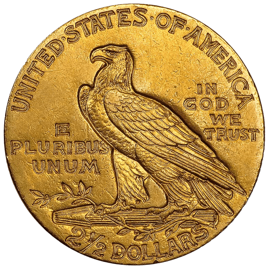- Rückseite: Zeigt einen stehenden Adler, der Pfeile und einen Olivenzweig hält, mit den Aufschriften „UNITED STATES OF AMERICA“, „E PLURIBUS UNUM“, „IN GOD WE TRUST“ und „2 ½ DOLLARS“.