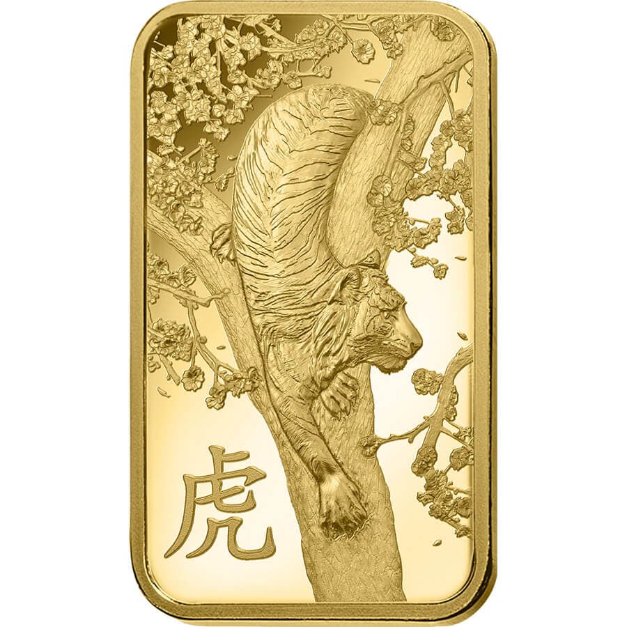 Mit innovativen und markanten Design, präsentiert dieser Barren den Tiger von vorne und von hinten (ein Markenzeichen den PAMP Mondkalender Serien). Auf der Vorderseite des Barrens befindet sich auch das chinesische Symbol, das auf Deutsch „Tiger“ bedeutet, während auf der Rückseite das Gewicht, die Reinheit und die eindeutige Seriennummer angegeben sind.