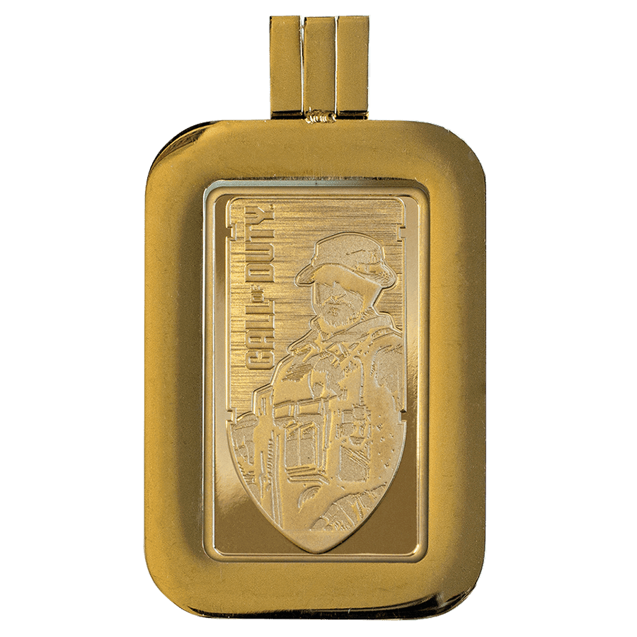 Die Vorderseite des Goldbarrens zeigt einen Soldaten in Montur, bereit zum Kampf. Der Goldbarren hat eine ähnliche Gravur wie der Umriss und das Design des digitalen Anhängers. Auf der Seite des Barrens finden Sie den vertikalen Schriftzug „Call of Duty".