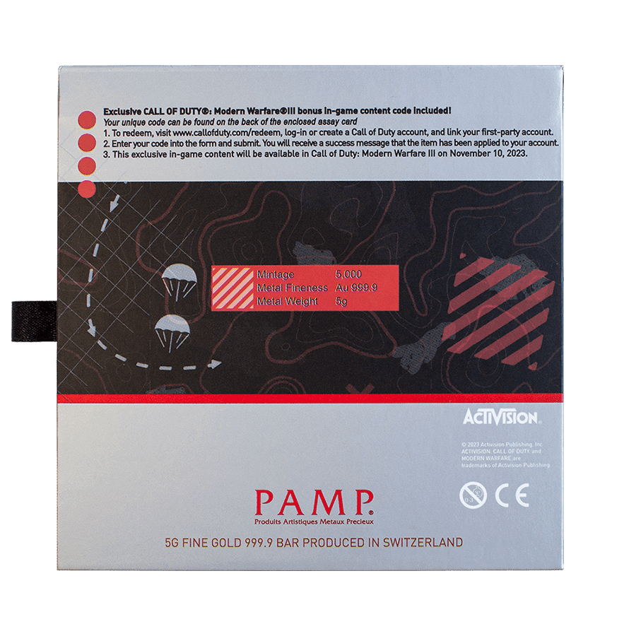 Zur Feier von Modern Warfare III wird der spezielle Call of Duty-Goldbarren für alle Fans und Sammler herausgebracht. Er ist Teil der PAMP Swiss Goldbarren-Kollektion, die von der weltbekannten Raffinerie MKS PAMP produziert wird, die für die Herstellung hochwertiger Goldbarren bekannt ist.