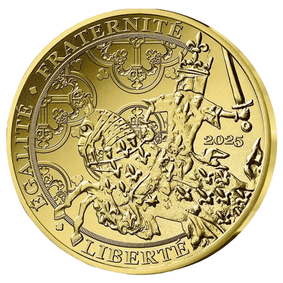 - Vorderseite: Zeigt König Jean II. „le Bon“ zu Pferd, inspiriert vom Franc à cheval aus dem Jahr 1360. Mit der Inschrift „Liberté Égalité Fraternité“ und dem Prägejahr 2025.