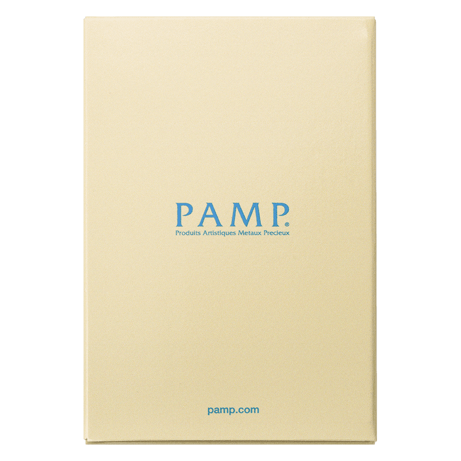- Rückseite: Mit dem Logo von PAMP Suisse, dem Gewicht „1 Unze“, der Reinheit „999,9“ und einer individuellen Seriennummer, umrahmt von einem passenden Davidstern-Motiv.