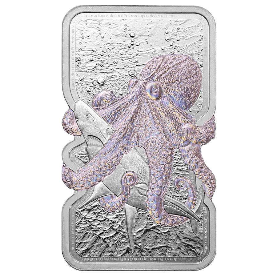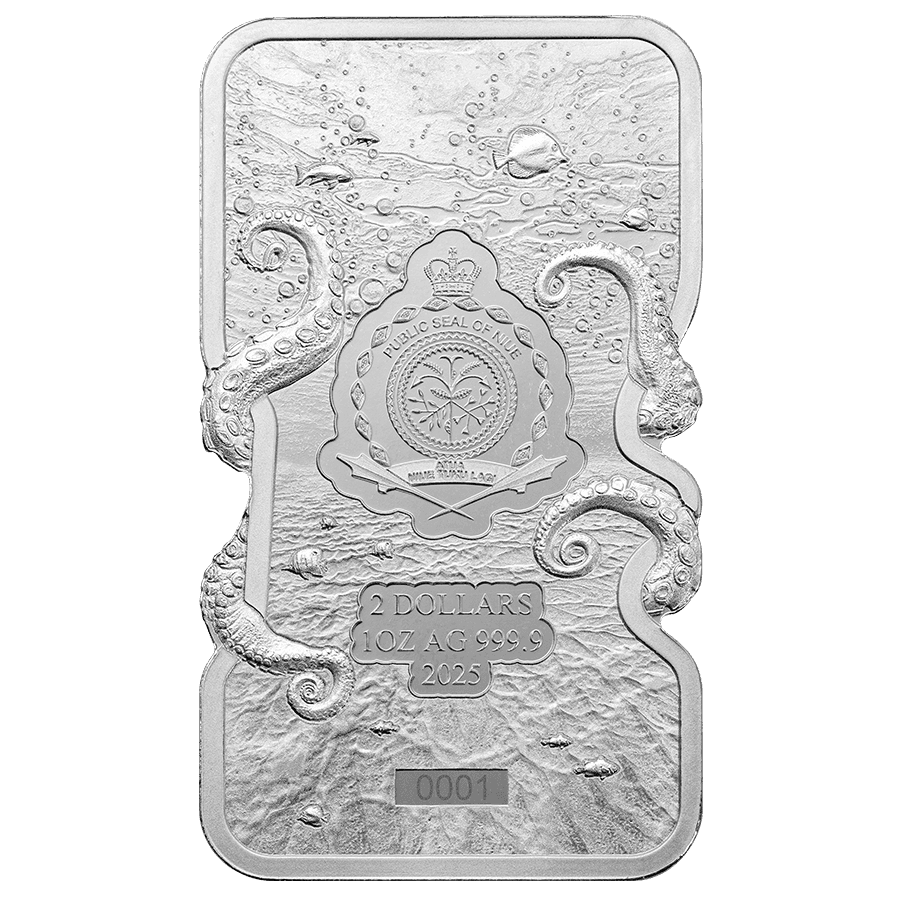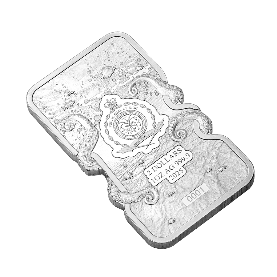 - Rückseite: Zeigt das Staatssiegel von Niue, umgeben von wirbelnden Kraken-Tentakeln. Trägt die Aufschriften des Nennwerts „2 Dollar“, das Gewicht, den Reinheitsgrad und das Jahr „2025“ sowie eine einzigartige Seriennummer.