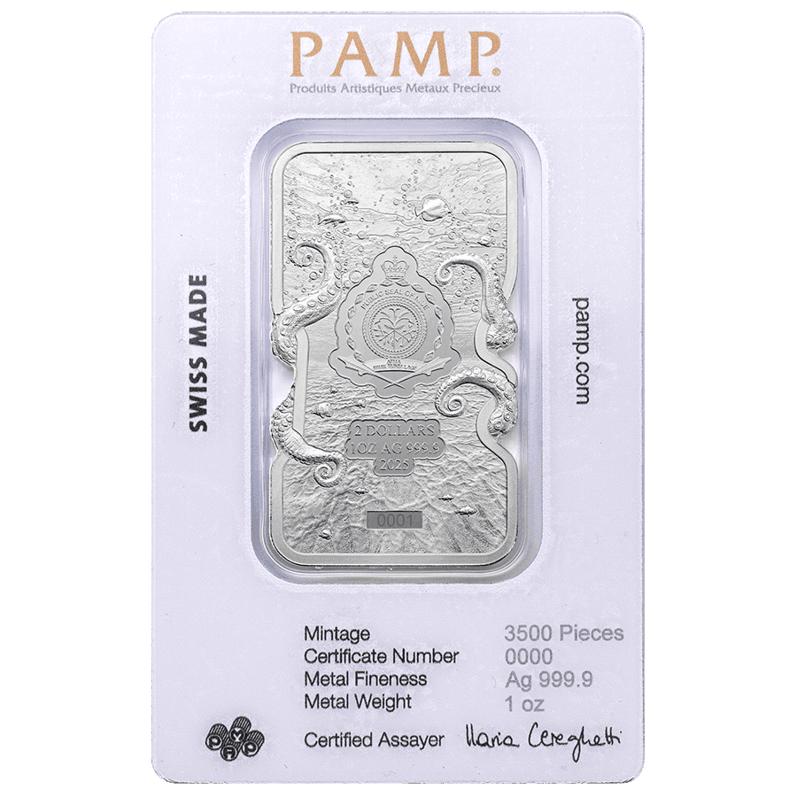 Dieser Silberbarren vereint den Wert von Edelmetallen mit atemberaubender Handwerkskunst. Als Teil der Nature's Grip-Serie richtet sich die Ausgabe 2025 an Sammler und Meeresliebhaber. Gefertigt aus Feinsilber bietet er langfristigen Werterhalt und kann eine großartige Ergänzung Ihrer Sammlung sein.