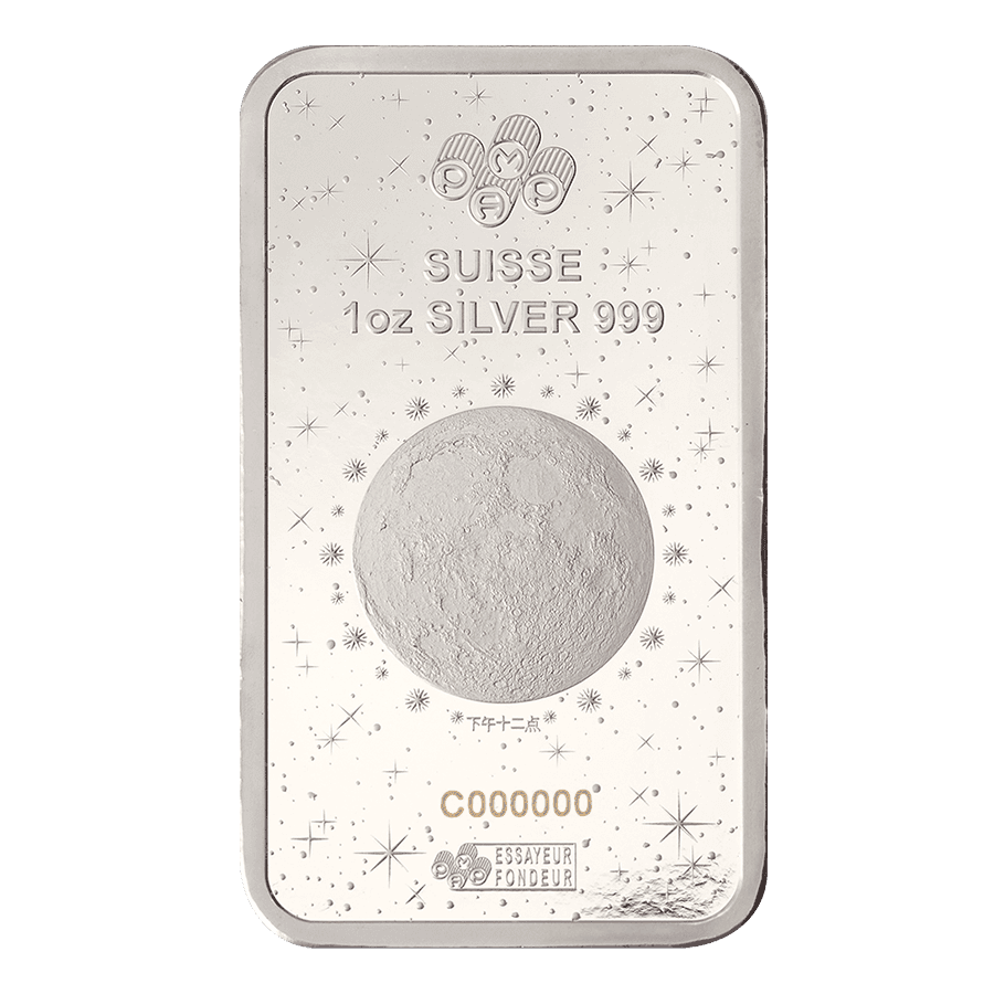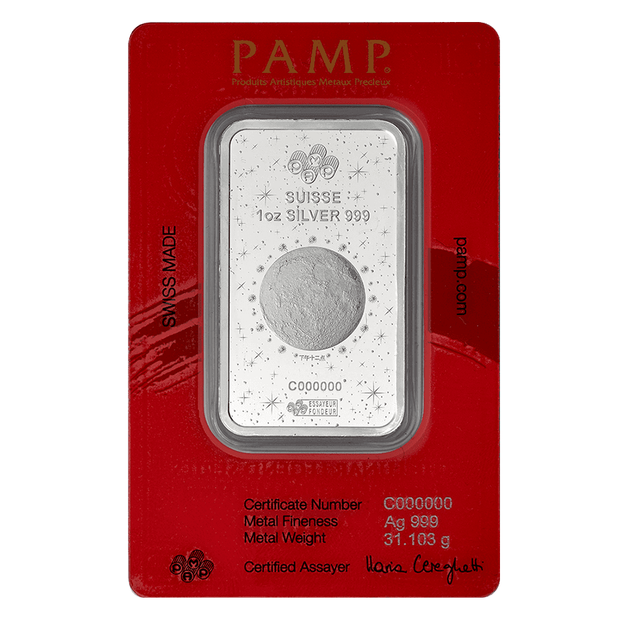 - Rückseite: Eine strahlende Vollmond-Szene, umrahmt von dekorativen Sternen, ergänzt durch das PAMP-Logo, Gewicht, Reinheit und eine individuelle Seriennummer.