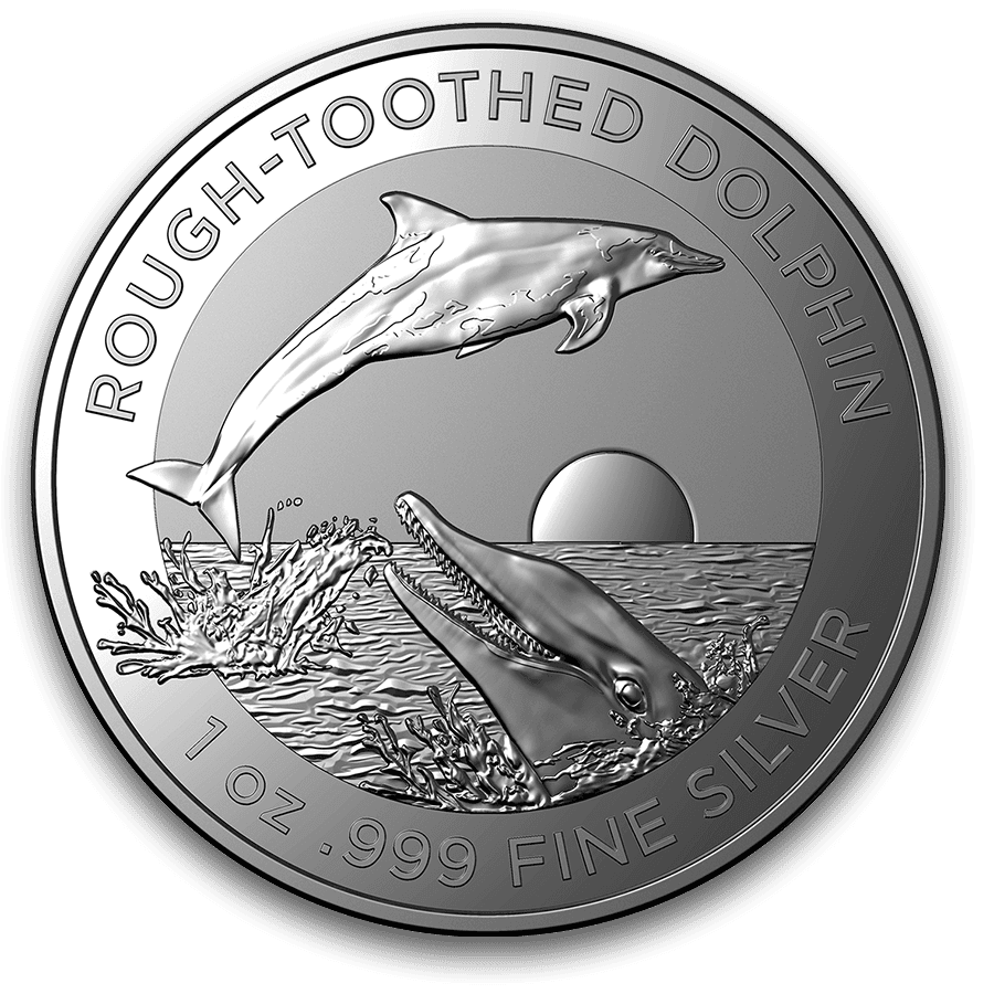 - Rückseite: Zeigt zwei Rauzahndelfine in ihrem natürlichen Lebensraum – einer springt dem Horizont entgegen, der andere taucht aus dem Ozean auf. Die untergehende Sonne im Hintergrund unterstreicht die detailreiche Meeresdarstellung, zusammen mit den Inschriften zu Metallgehalt und Reinheit.