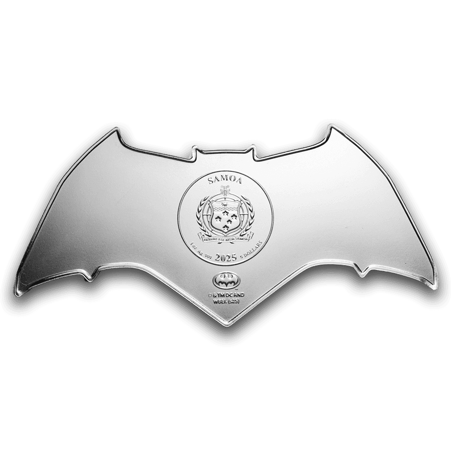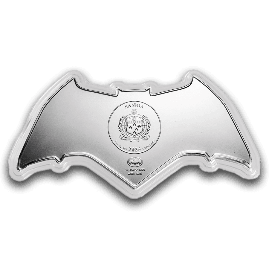 - Vorderseite: Zeigt das Wappen von Samoa in der Mitte der Batarang-Silhouette, ergänzt um das Jahr „2025“, den Nennwert „5 DOLLARS“, Reinheitsangaben und ein kleines Fledermaus-Logo mit Lizenzvermerk.