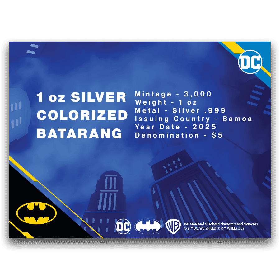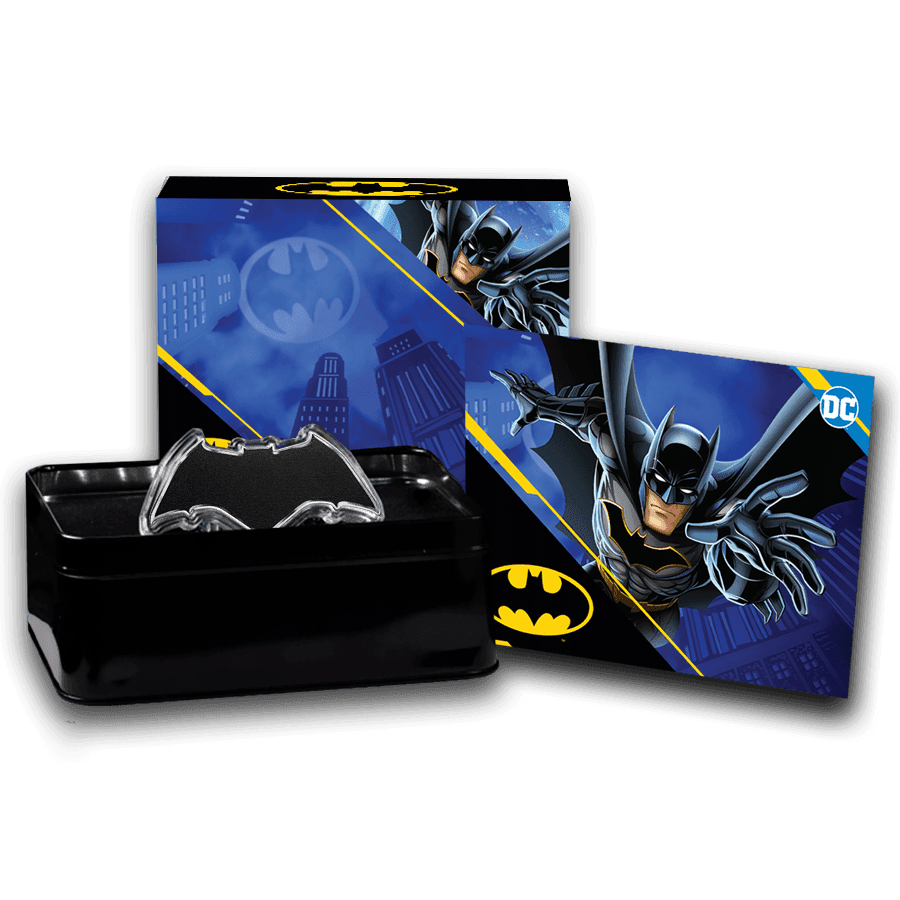 - Einzigartige Merkmale: Offiziell lizenzierte DC-Comics-Ausgabe. Präzise geschnittene Batarang-Form mit vollständig schwarzer Beschichtung. Limitierte Auflage von 3.000 Münzen.