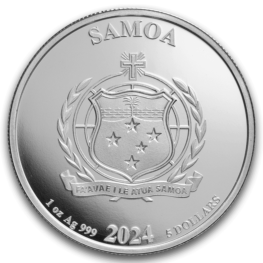 - Vorderseite: Zeigt das Wappen von Samoa, die Jahreszahl „2024“ und den Nennwert „5 DOLLARS“, was den Status als gesetzliches Zahlungsmittel bestätigt.