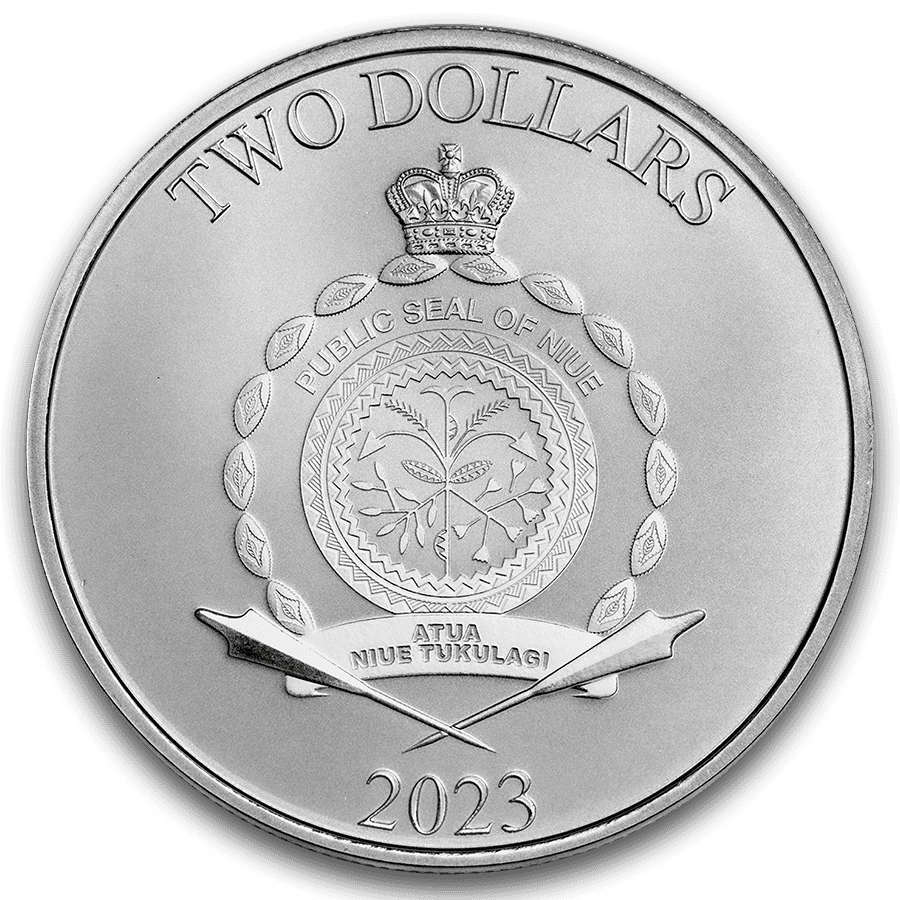 - Vorderseite: Zeigt das Staatswappen von Niue zusammen mit dem Nennwert „2 $“ und dem Jahr „2023“, was den Status als gesetzliches Zahlungsmittel bestätigt.