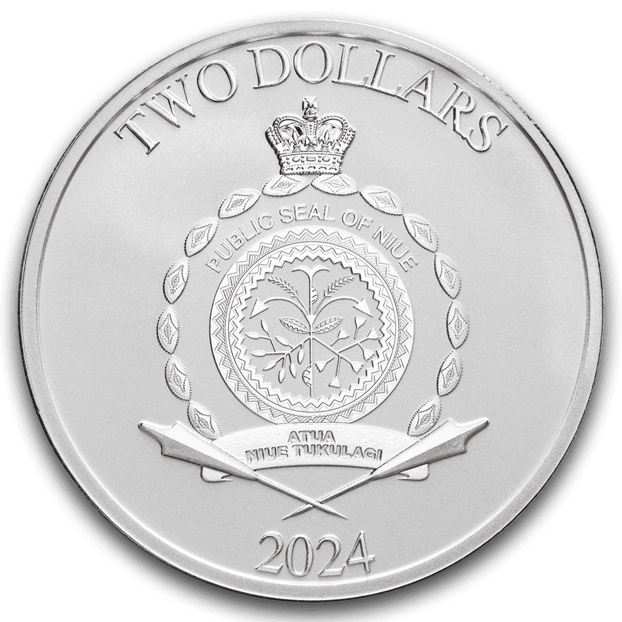 - Vorderseite: Zeigt das Staatswappen von Niue mit dem Nennwert „2 $“ und dem Jahr „2024“, was den Status als gesetzliches Zahlungsmittel bestätigt.