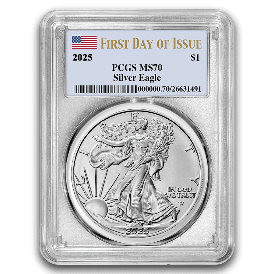 - Verpackung: Gekapselt in einem manipulationssicheren PCGS-Etui mit schlichter Beschriftung: „Silver Eagle“, Einstufung MS-70 und dem Vermerk First Day of Issue mit US-Flaggendetail.