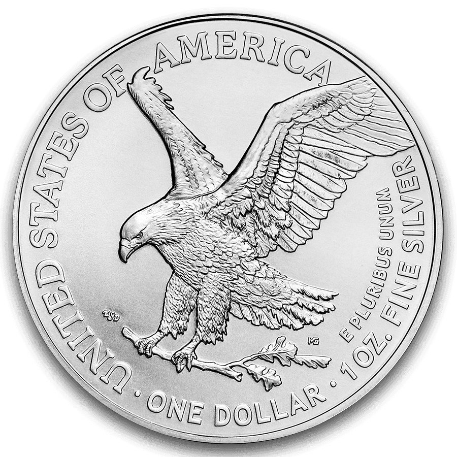 - Rückseite: Darstellung eines fliegenden Adlers mit einem Eichenzweig in den Fängen, umgeben von den Inschriften: „UNITED STATES OF AMERICA“, „ONE DOLLAR“, „1 OZ. FINE SILVER“ und „E PLURIBUS UNUM“.
