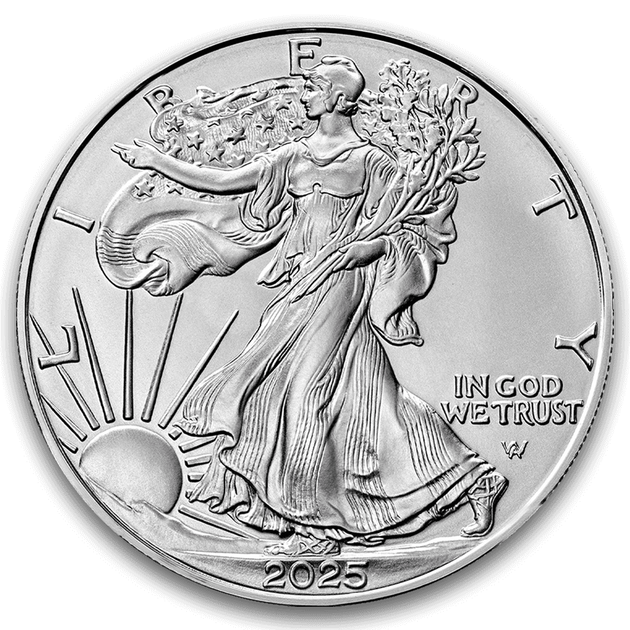 - Vorderseite: Zeigt Adolph A. Weinmans klassisches Walking Liberty-Motiv – Liberty schreitet der aufgehenden Sonne entgegen und trägt Zweige von Eiche und Lorbeer. Die Inschriften lauten: „LIBERTY“, „IN GOD WE TRUST“ und das Prägejahr „2025“.