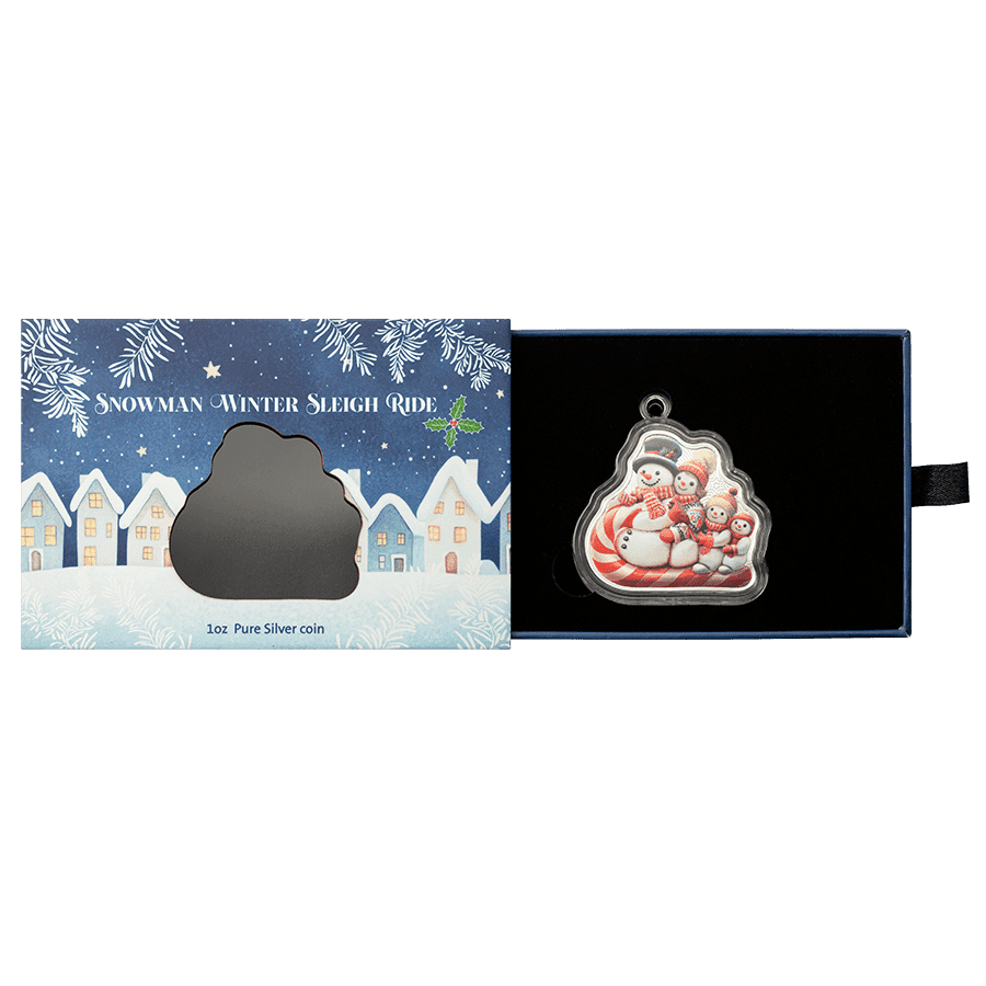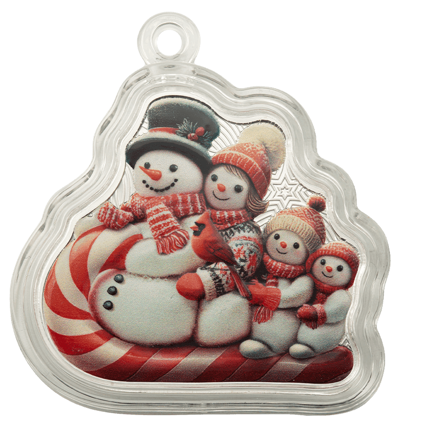 - Vorderseite: Eine fröhliche Schneemannfamilie fährt auf einem Zuckerstangenschlitten – lebendig koloriert und mit liebevollen weihnachtlichen Details. Die geformte Münze fängt die nostalgische Stimmung der Feiertage auf verspielte Weise ein.
