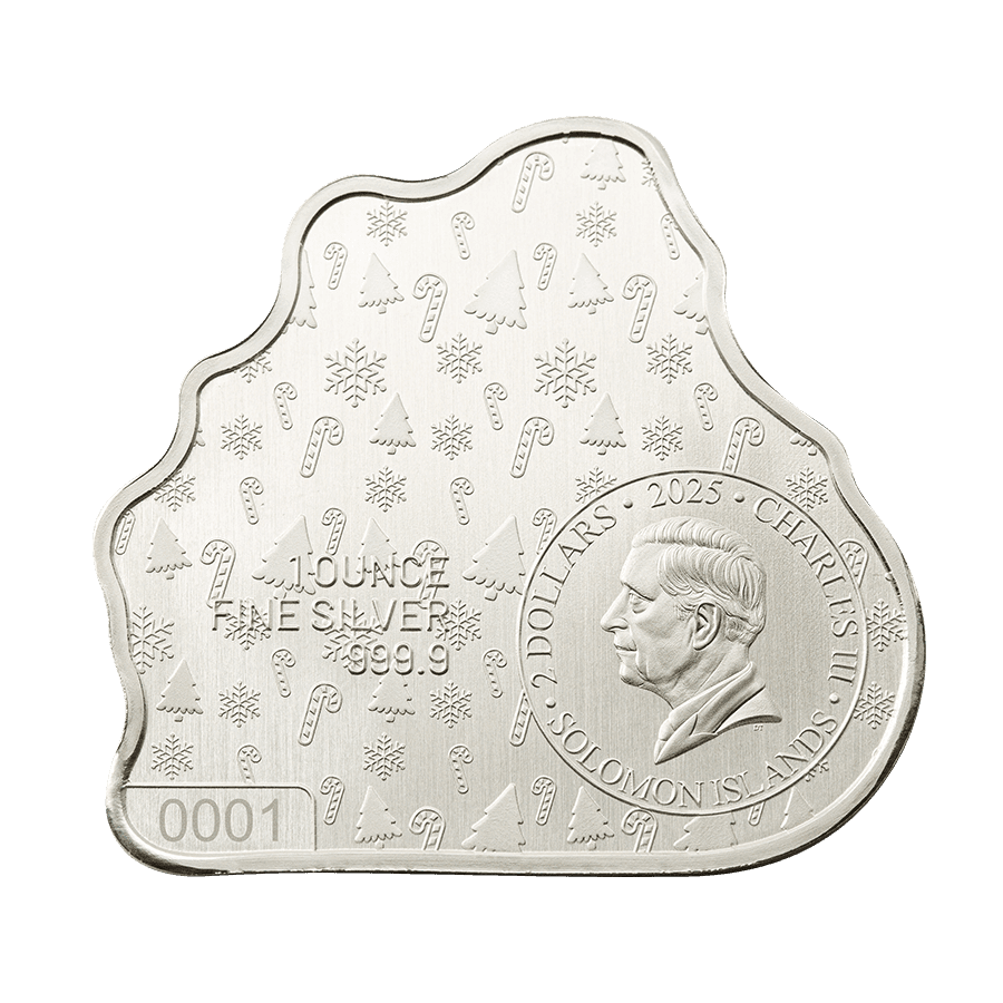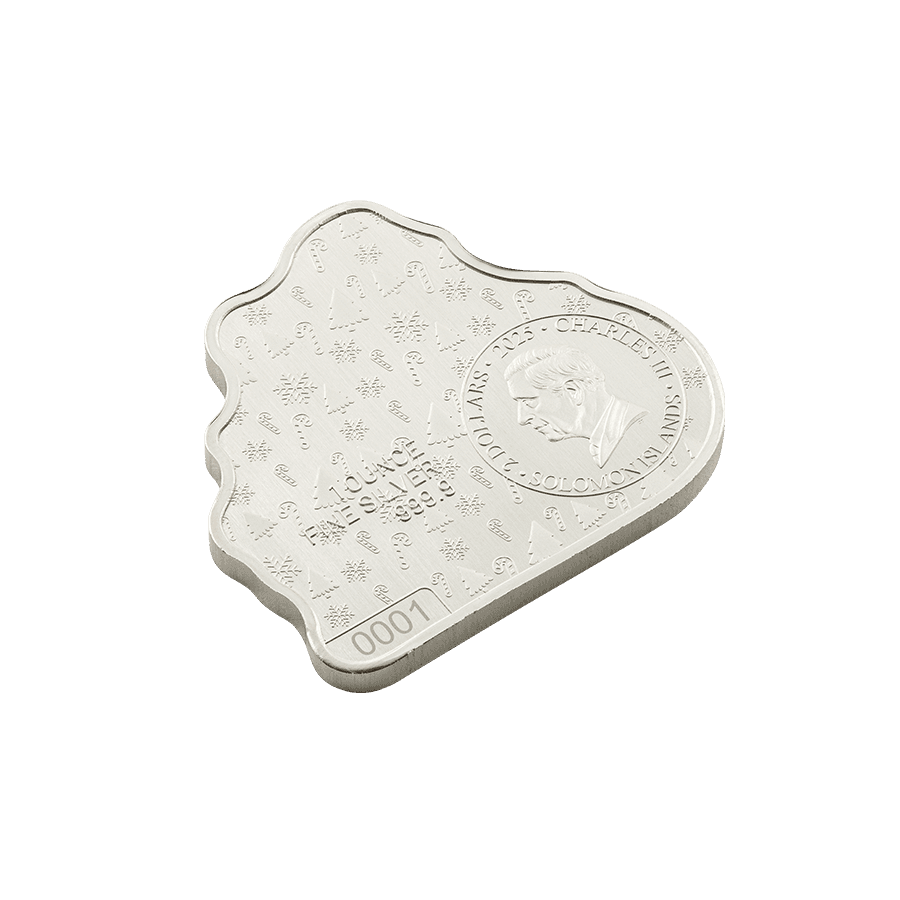 - Rückseite: Zeigt das Porträt von König Charles III sowie die Inschriften „2025“, „CHARLES III“, „SOLOMON ISLANDS“, „2 DOLLARS“ und „1 OUNCE FINE SILVER 999.9“. Der Hintergrund ist mit dekorativen Weihnachtsmotiven wie Zuckerstangen und Tannenbäumen verziert.
