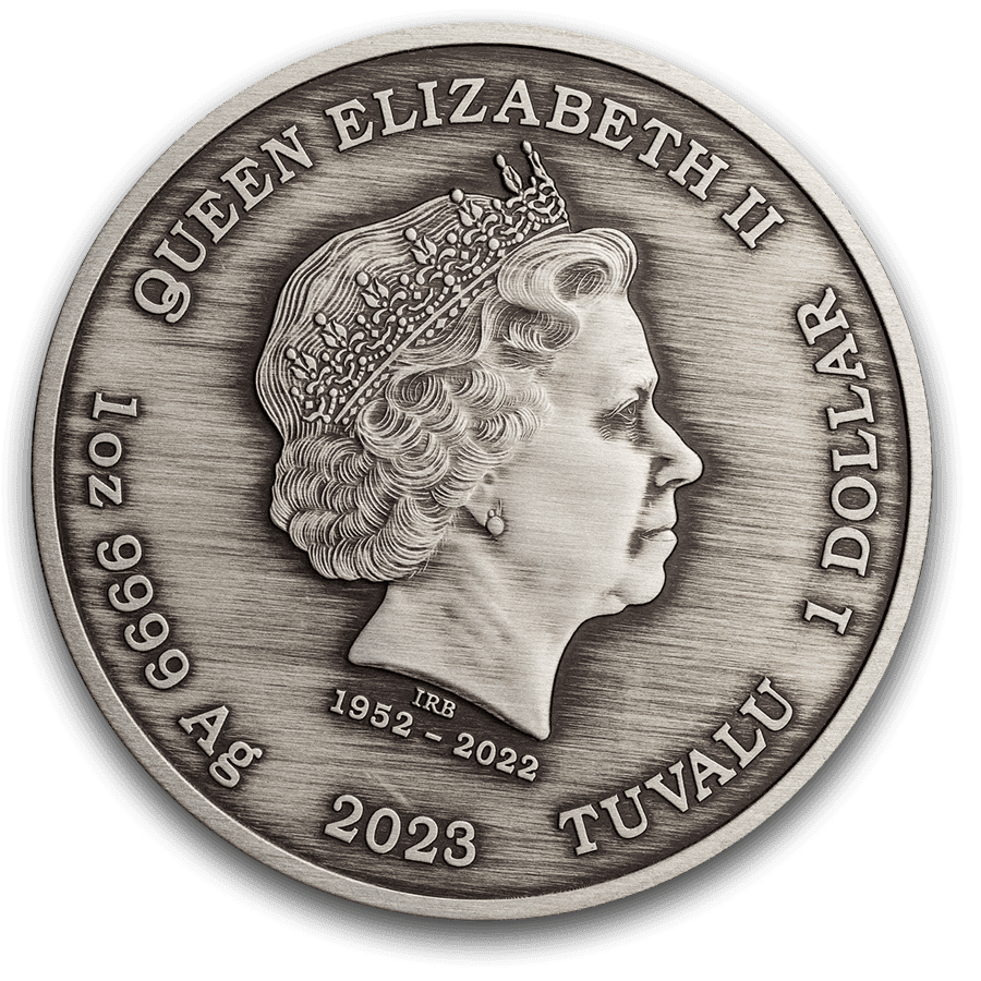 - Vorderseite: Zeigt das von Ian Rank-Broadley entworfene Porträt Ihrer verstorbenen Majestät Königin Elizabeth II., mit der Inschrift: „QUEEN ELIZABETH II“, ihrer Regentschaft „1952-2022“, „2023“, „TUVALU“, „1 DOLLAR“ und „1 OZ 9999 Ag“.