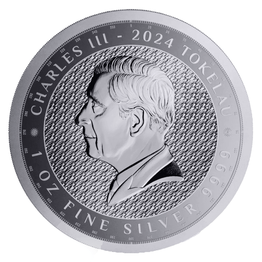 - Vorderseite: Zeigt das Profil von König Charles III mit den Inschriften „CHARLES III“, „2024“ und „TOKELAU“ sowie der Angabe zu Gewicht und Reinheit „1 OZ FINE SILVER 9999“.