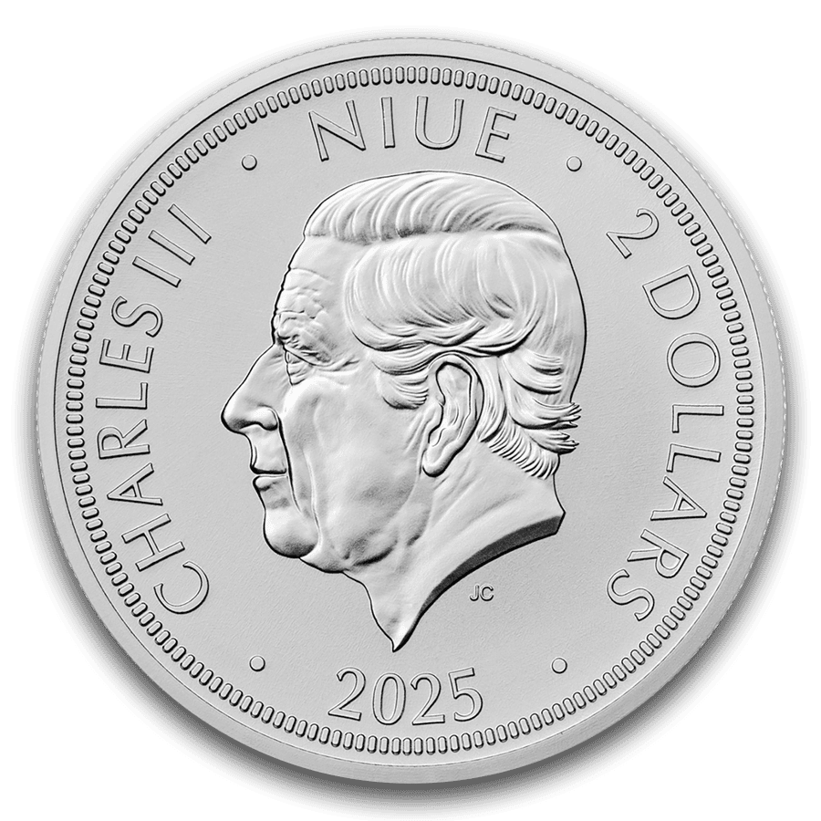 - Vorderseite: Zeigt das Porträt von König Charles III. mit den Inschriften „NIUE · 2 DOLLARS · 2025“, die den Status als offizielles Zahlungsmittel bestätigen.