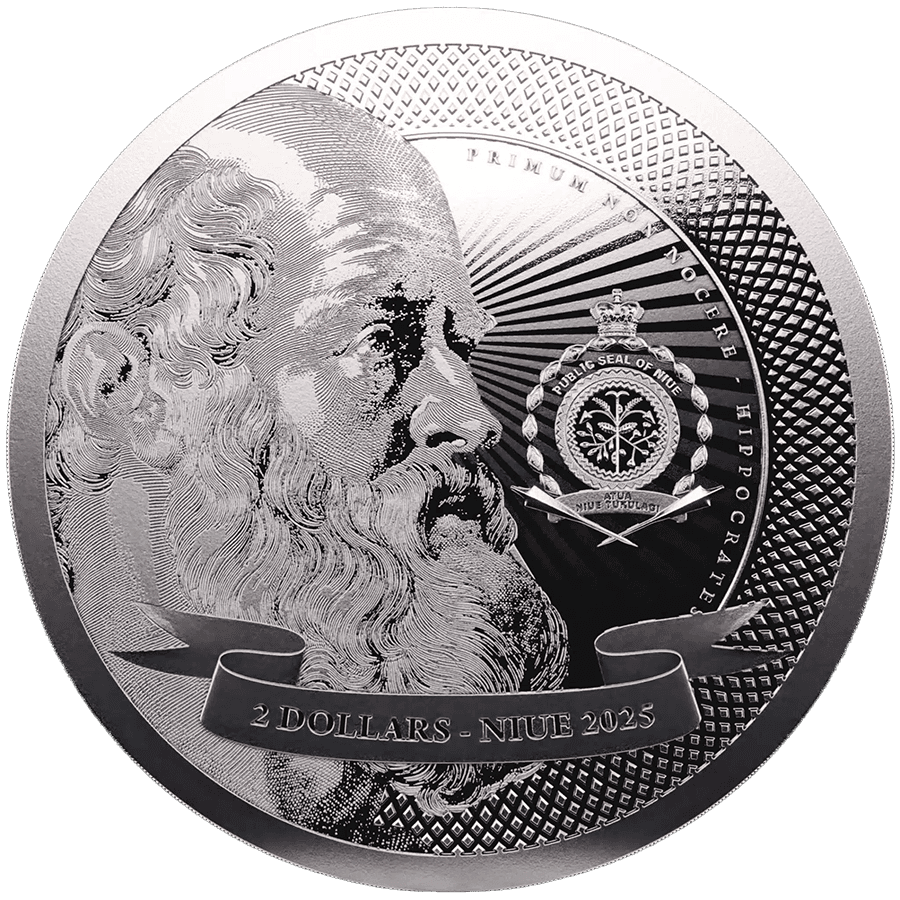 Die 2025er-Ausgabe von Vivat Humanitas würdigt das bleibende Erbe der Medizin durch die Figur des Hippokrates. Geprägt von der Pressburg Mint und ausgegeben von Niue, besteht die Münze aus 999,9 Feinsilber und regt zum Nachdenken über ethischen Fortschritt und menschliche Werte an – und das kombiniert mit der Verlässlichkeit einer physischen Silberanlage.