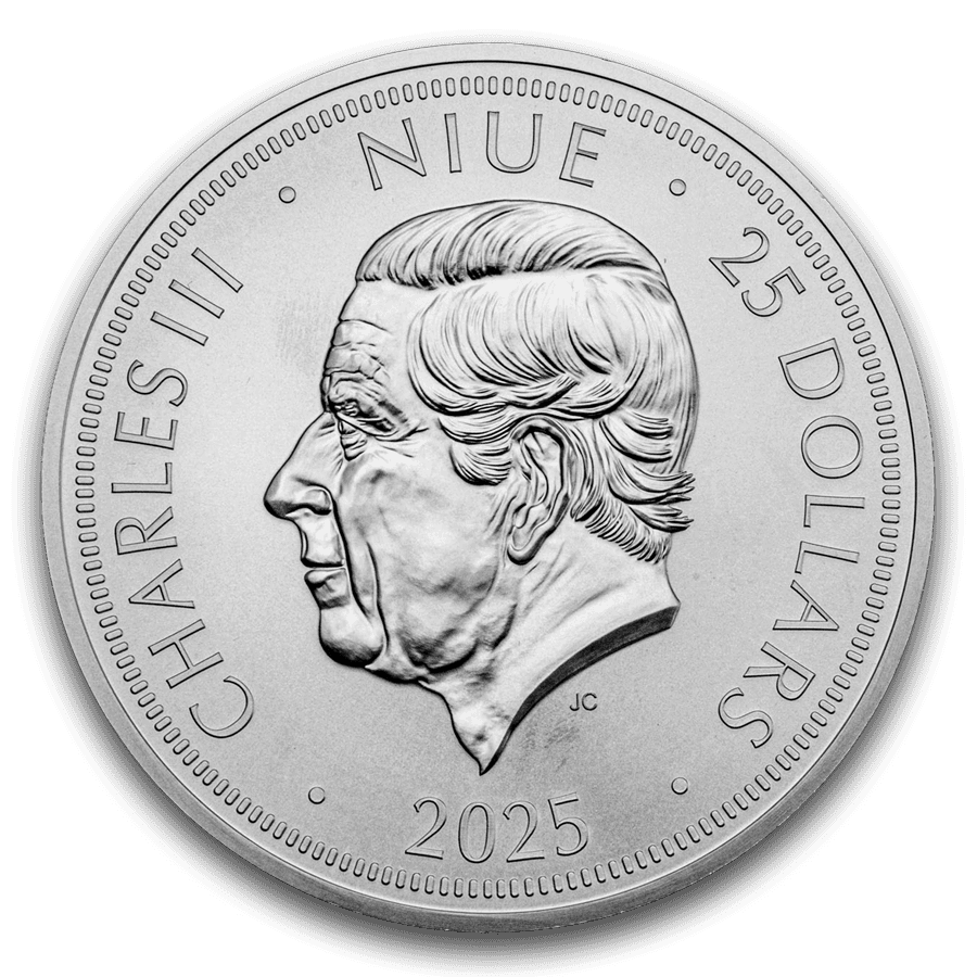 - Vorderseite: Zeigt das Porträt von König Charles III. mit den Inschriften „NIUE · 25 DOLLARS · 2025“, die den Status als offizielles Zahlungsmittel bestätigen.